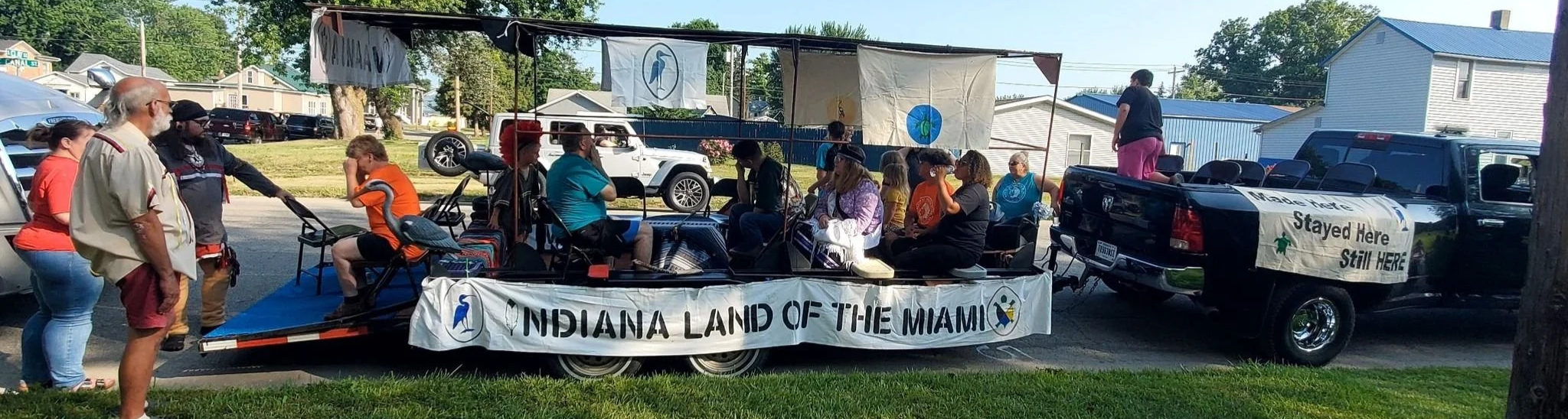 Peru Circus Parade Float (2023). Banners affirming “Made here, Stayed here, Still here” and “Indiana Land of the Miami” adorn the float alongside banners of turtles and cranes.