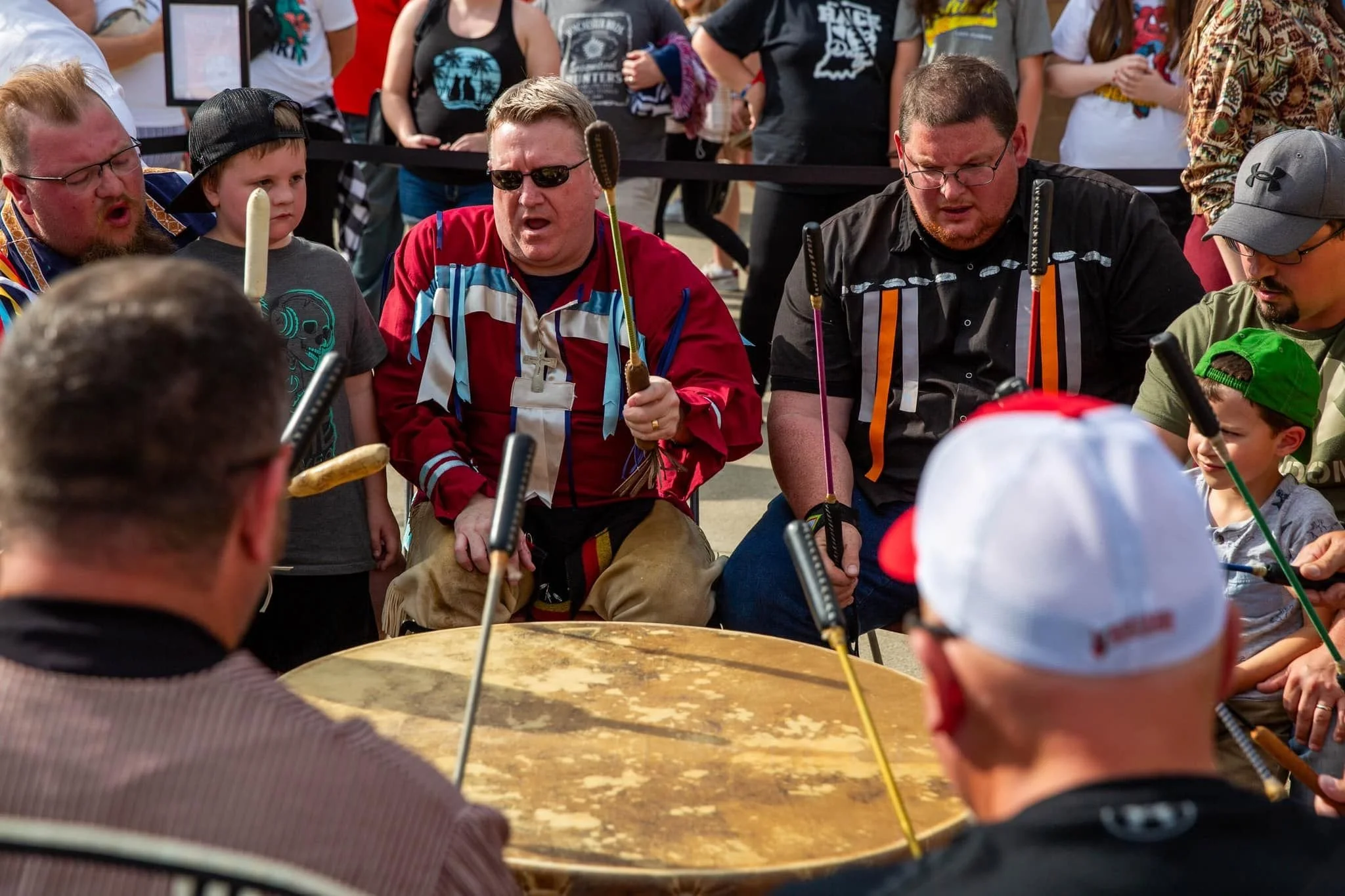 Several men travel with the drum to events across the Lower Great Lakes. Only Miami men and those invited may drum. When you see drumming in public, it is respectful to keep a distance from the drums and drummers. For more information, please refer to this guide to the Miami Nation Smudge and Drumming Ceremony, prepared for the Indianapolis Indians.